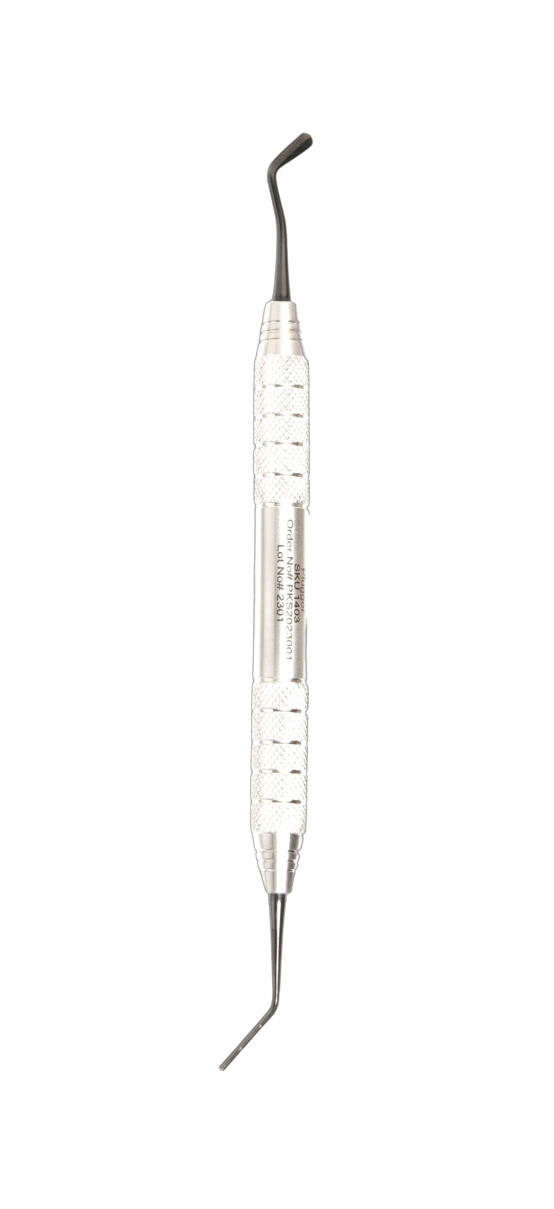 - Dual-function design — Plugger end for gutta-percha condensation; blade end for temporary filling placement